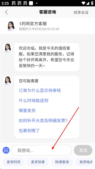 4、在客服咨询页面的输入框中输入问题,点击发送即可与客服沟通。
