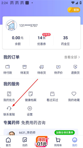 1、在1药网App首页点击底部的我的选项,进入个人中心页面。