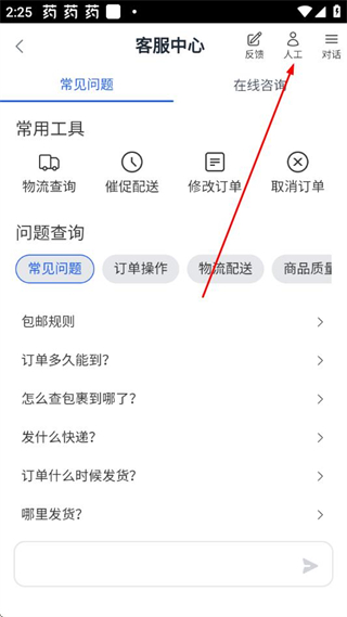 3、在客服中心页面点击右上角的人工选项,进入客服咨询对话页面。