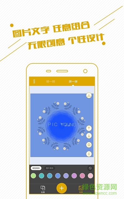 “拼”模块中,6种比例图文混排,77种字体随心选择,复制/图层顺序切换/图层锁定,纯色背景与图片背景填充