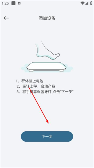3、在连接引导页面,按照提示完成设备启动操作后,点击下一步,进入设备搜索页面。