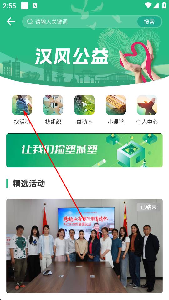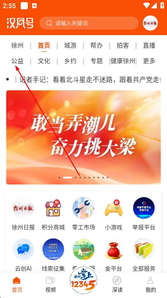 1、打开汉风号App,进入首页,点击导航栏公益选项。