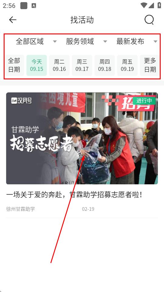 3、在找活动页面,筛选区域、服务领域、最新发布和日期后,点击感兴趣的公益活动进入。