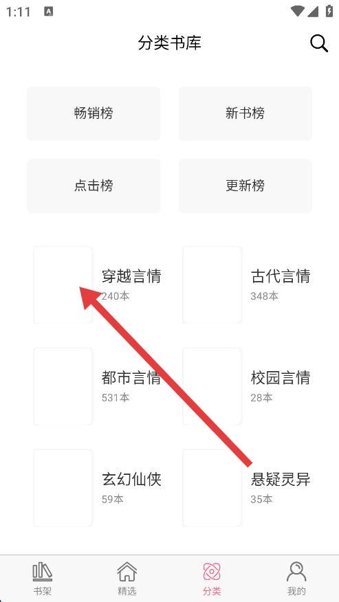 2、在分类书库页面,浏览并点击感兴趣的小说类别。