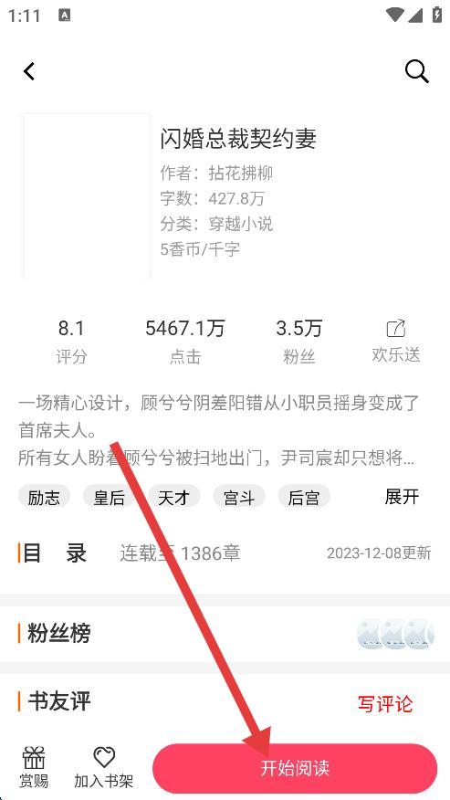 4、进入小说详情页面后,点击下方的开始阅读按钮,即可开始阅读。