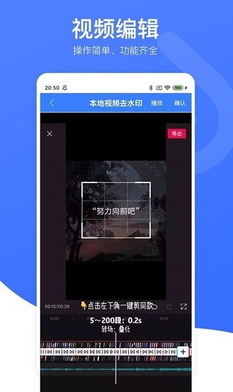 视频去水印星球app可以帮助用户轻松的去除图片视频中的各种水印,是一款非常好用的图片视频去水印软件,操作也是非常简单的,简单的框选即可快速的完成水印的清除,软件还提供了超多的视频剪辑功能,帮助大家轻松的去进行视频处理的操作。