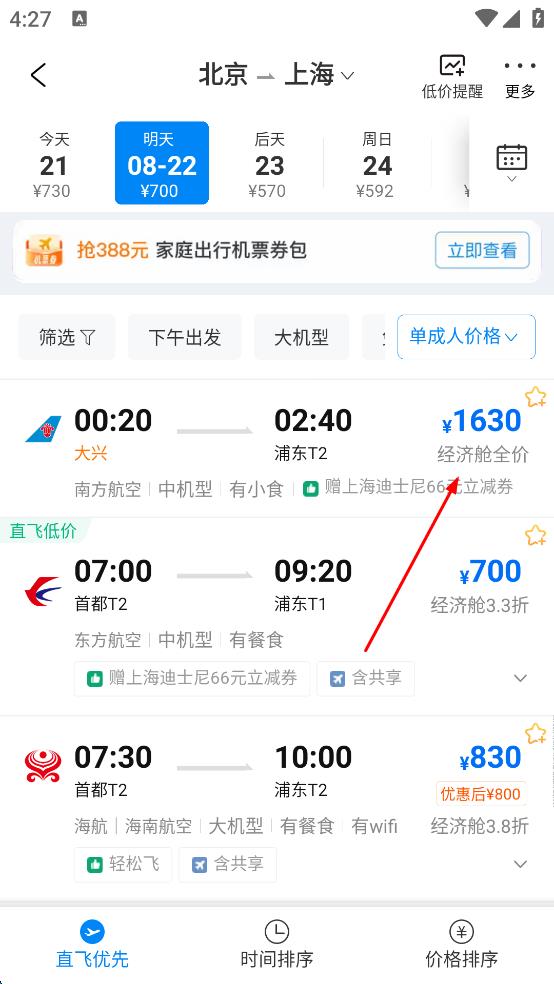3、查询结果展示后,浏览不同航班的起飞到达时间、价格、航空公司等详情,点击心仪航班对应的区域,进入该航班的订单填写与支付环节 。
