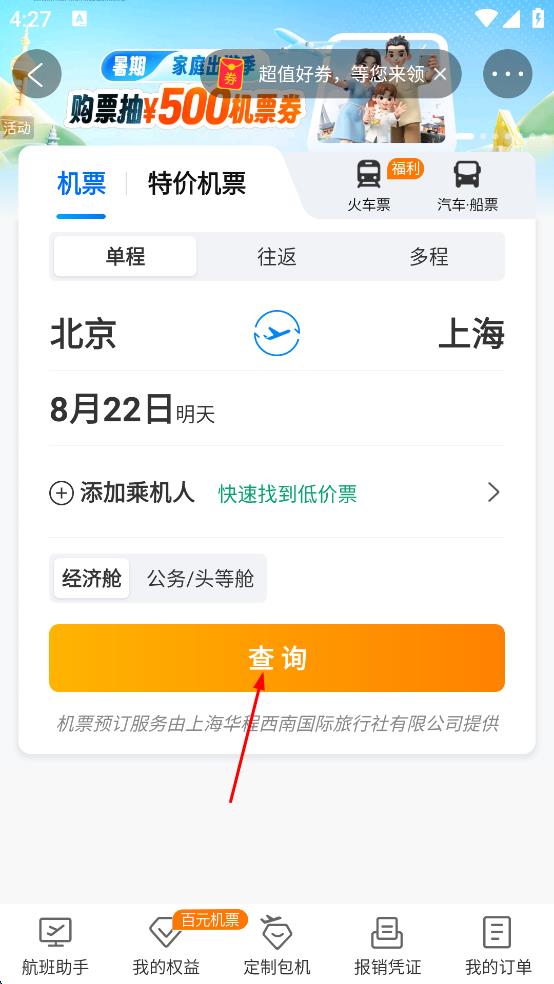 2、在机票预订页面,选择行程类型(单程、往返等),填写出发地、目的地、出行日期,添加乘机人,选定舱位后点击“查询”,获取符合条件的航班信息。