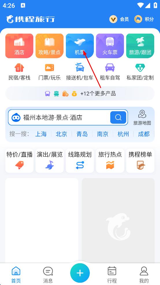 1、打开携程旅行APP,进入首页后,点击顶部“机票”图标,切换至机票预订专属页面,可在此进行后续机票查询操作。