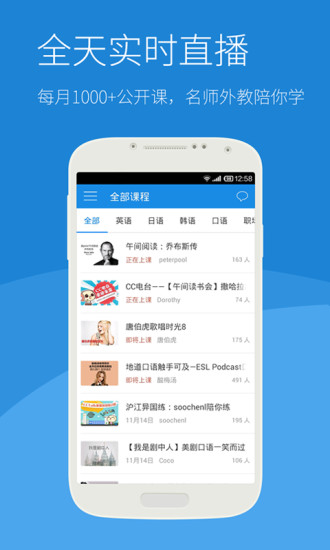 在这里,英、日、韩、法、德、西……全语种全覆盖。全天直播,随到随练。万人口语角,外国人免费陪练。它是一款社群学习平台。在这里,你可以组建学习社群,相互解惑、传授知识。语言、兴趣、职场、技能、K12、互联网,学无止境。