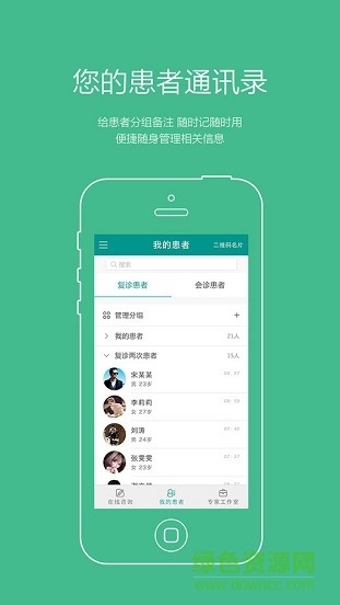 2、我的患者:您的患者通讯录。给患者分组、备注,随记随用,便捷随身管理相关信息。