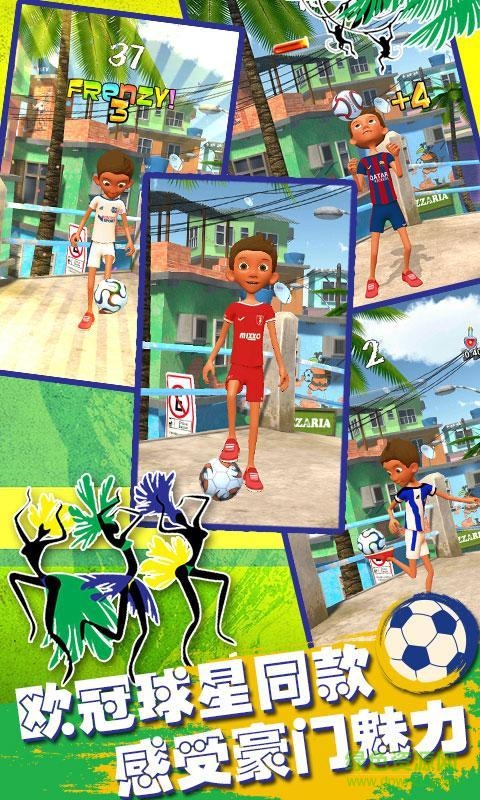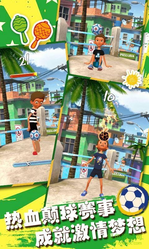 这是创意十足以“足球王国”巴西为游戏场景的虐心之作!聚集了欧冠各大俱乐部及亚洲各国等300多件球衣,以历届“世界杯同款“足球为原型参照的26种球型,并提供了几十种经典颠球动作如:双脚脚背颠球、头部颠球、各部位连续颠球… …