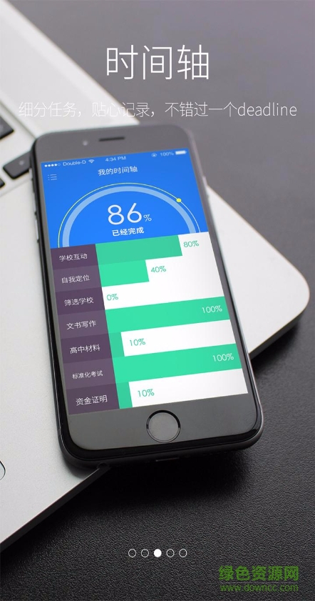 6.时间轴:细分申请任务、贴心记录申请过程中学生取得的阶段性成就以及与学校的互动,同时提供任务提醒,不错过一个Deadline。