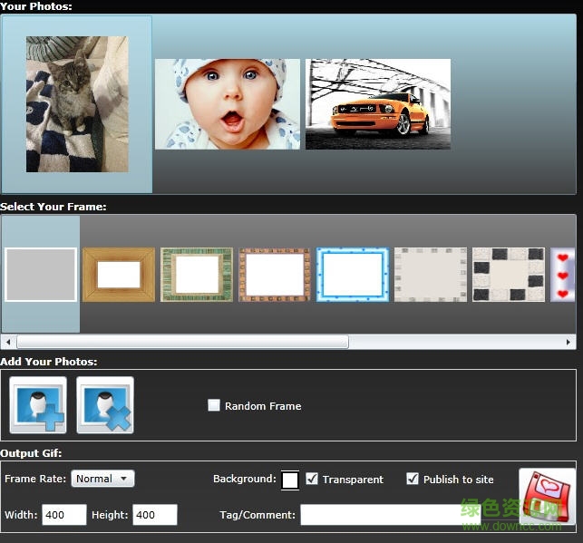 免费 Gif 拼贴画制造商接受 JPEG 和 PNG 图像作为输入文件,并包括一个丰富框架集,您可以选择从。可以在线发布结果。