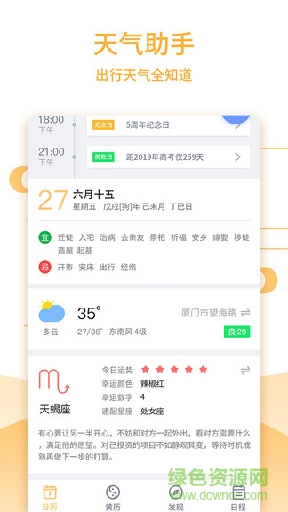 万年历大全安卓最新版是一款非常好用的手机万年历app,可以显示当天详细的农历公历日期,有贴心的天气、宜忌事项、星座运势等题型,还可以进行日程管理和设置闹钟,欢迎有需要的朋友下载使用!