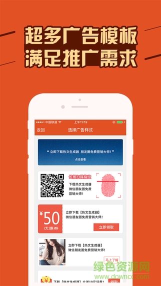 热文生成器app是专为微商用户提供的一款产品推广神器,该应用内提供了超多广告末班,满足推广者多样化的需求,每日都会更新热门文章视频,你可以将自己的产品植入到热门中,免费群发广告,大家都会帮你转载,快速的提高产品的知名度,提高销售量,需要的用户快来绿色资源网下载吧!