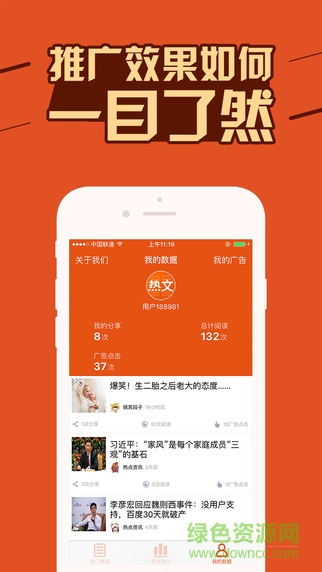 微信里有很多很受欢迎的文章,往往转发量可以上十万甚至更多。我们在【热文生成器】中挑一篇和目标人群比较搭配的热文,1分钟就能将自己的广告加入热文中,让自己的广告随着热文无限传播。我们还可以查看文章的传播情况,如【阅读数】、【广告点击数】等详细数据。
