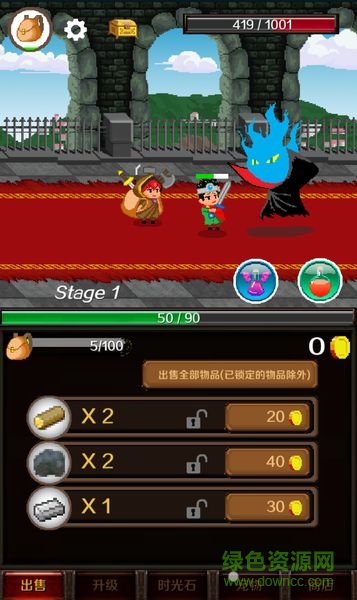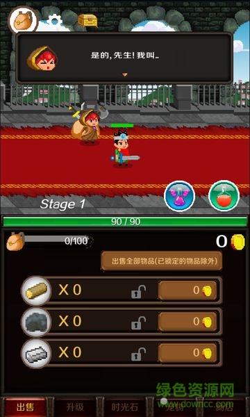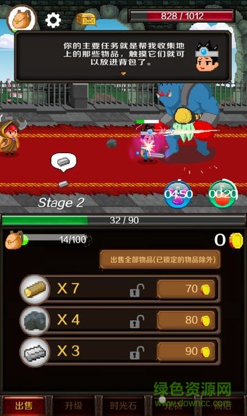 游戏中你扮演骑士的侍从,他打怪你需要帮他捡东西,将捡到的木材、钢铁等拿去卖掉换取金币,用换来的金币给骑士升级技能、血量等。
