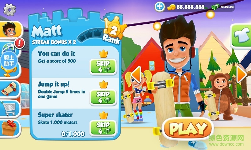 天空滑行者内购(skyline skaters修改版)是一款为玩家打造的跑酷类休闲游戏,在这里可以有四个角色供玩家选择,另外除了帅哥跟萌妹子,还有一只狗熊,玩家滑行的地点都是在屋顶上,我们滑行的过程中得不停地吃金币!更多精彩等您来体验!喜欢就来绿色资源网下载体验吧!