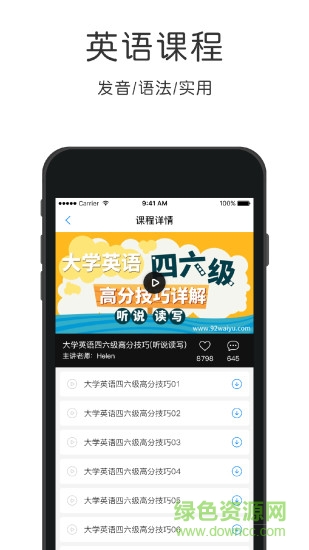 助你高效掌握英语四级备考的要点、核心知识、口语和听力!相应的四级备考课程,搭配数千个趣味英语电影短视频,以强大的智能配音和口语模仿操练功能,在趣味、轻松的氛围中,短时间内迅速提高英语实用口语能力,以应对英语四级的口语和听力相关考试要求,并能掌握大量地道日常交流和生活场景英语口语,此外,针对需要系统积累英语知识的学员我们还提供了海量英语课程,包括:大学四级真题详解、大学四六级考试技巧、新概念英语、剑桥国际口语、商务英语(BEC)、做生意常用英语、雅思口语、学位英语等丰富内容,在应对大学四级考试的同时提升英语实用能力!
