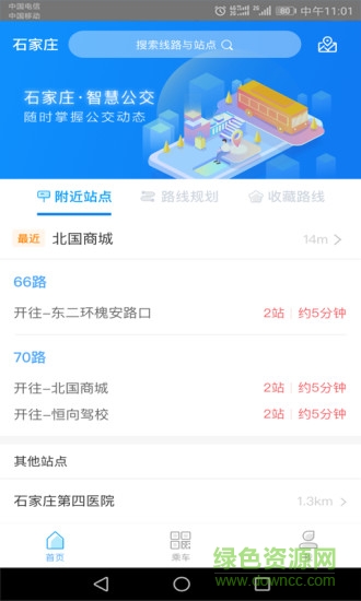 3.石家庄市民可以随时随地定位搜索附近的公交站点,查看公交到站情况
