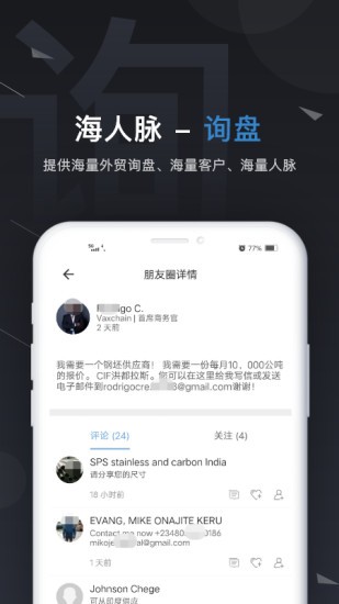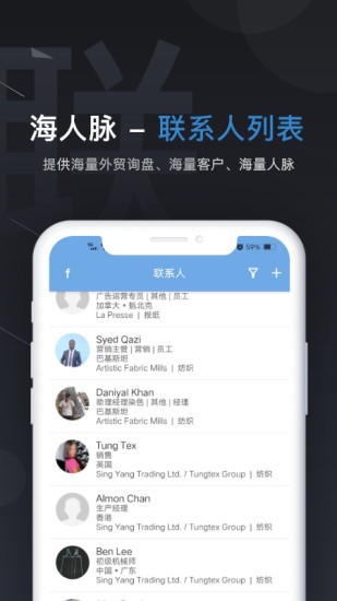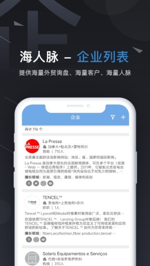 外贸需要的是询盘、客户、人脉,海人脉专注提供海量外贸询盘、海量客户、海量人脉、海外社媒营销的APP,帮助外贸企业、外贸业务员,方便找询盘、找海外客户、建立自已的海外人脉圈,解决没有海外人脉、海外市场开发难等问题,提高销售效率。