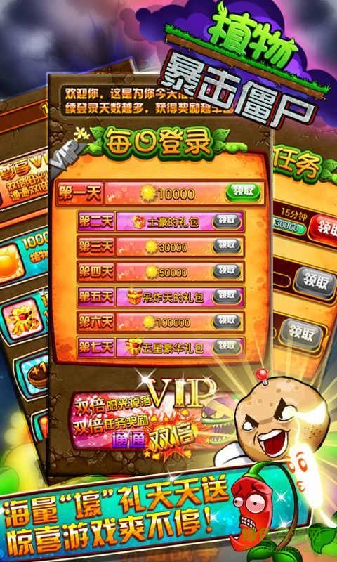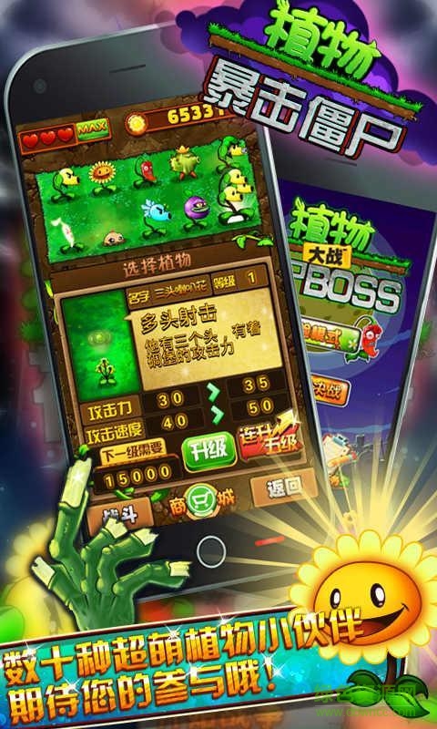 一旦上手,绝对过瘾!10余种超萌植物,20种搞怪僵尸,多种僵尸BOSS…更有新加入的小伙伴组团系统,让你组成史上最强的超萌植物战队,与僵尸BOSS来一场酣畅淋漓的超决战!每天更有“壕”礼相送哦!
