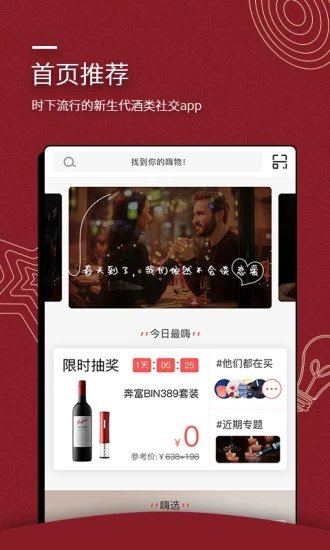 温暖,有趣的酒类社交 APP。数千万酒类爱好者用户聚集在此,无顾虑的畅聊葡萄酒,遇见酒友。很多人因此成为了朋友,男女朋友,甚至夫妻。时下超火的弱关系社交,通过完成30秒的“嗨精灵测试”,来找到心灵相通的酒友。更有懂你酒类算法,秒推懂你喜欢的酒款,随时随地聊天分享~还有许多线下酒局!!