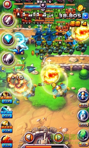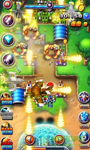 升级各式导弹、激光、电击、减速炮塔的科技,抵御一波波潮水般的敌军