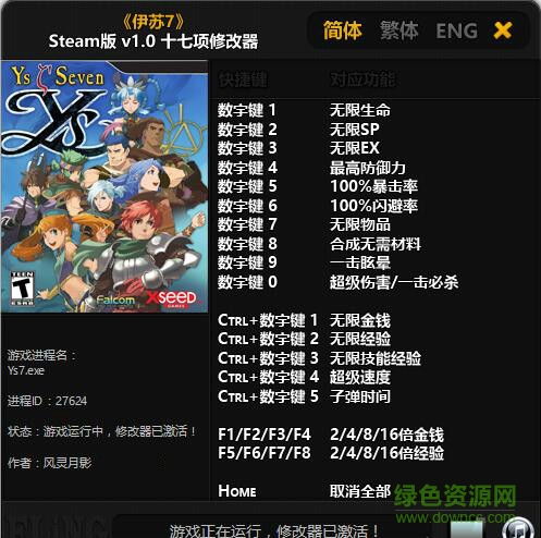 伊苏7十七项修改器是一款功能强大的游戏修改器,主要针对该游戏玩家打造,使用修改器玩家可以一键修改游戏中各项重要属性,操作简单免费使用,欢迎来绿色资源网下载!