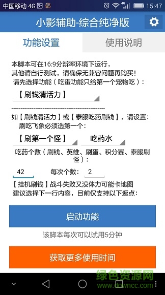 4.功能【刷钱清活力】设置:第一行设置【刷钱清活力】,第二行设置吃药水或者不吃,和个数。【需要手动刷一次,再启动】。脚本不帮买药水,需要购买足够大药水。不兼容分辨率的手机可能出现不吃体力药水。
