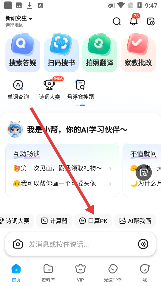 1、打开作业帮APP,在首页下方点击口算PK选项。