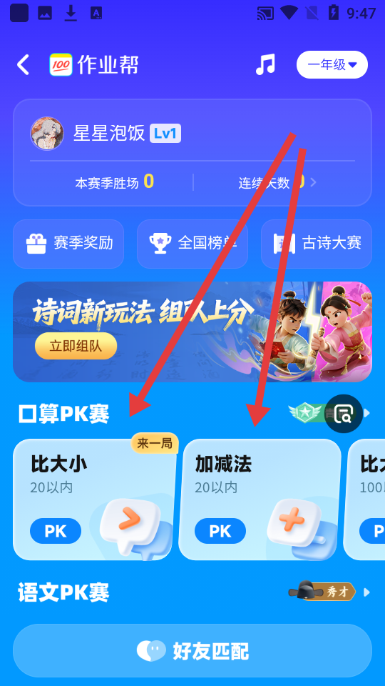 2、进入口算PK赛页面,选择想要参与的口算题型,比如比大小、加减法等,并点击PK按钮。