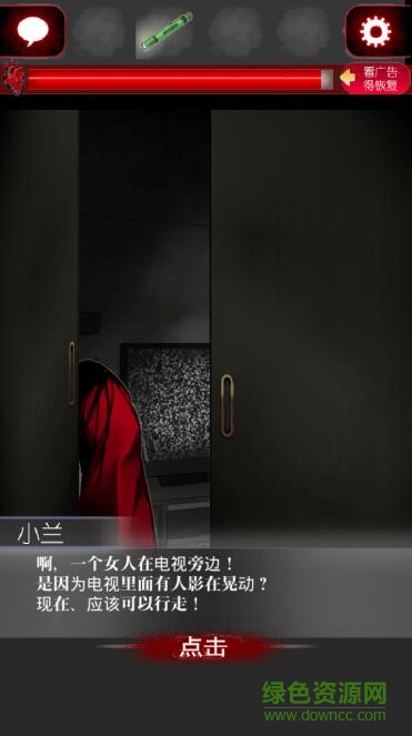 一开始一段剧情,然后聊聊天,从柜子里出去,再四处转转。于是,又在餐桌那里发现女鬼了,好可怕啊。接下来我们要做的是吸引女鬼的注意力。走到电视机前,面前突然多了好多东西,有遥控器,电池,都捡起来。然后躲在柜子里,先点遥控器,再点电池,然后两个就可以合成了。再点下合成的遥控器,选择使用。出去以后,我们就发现女鬼在看电视,嗯,我们让她看去吧。