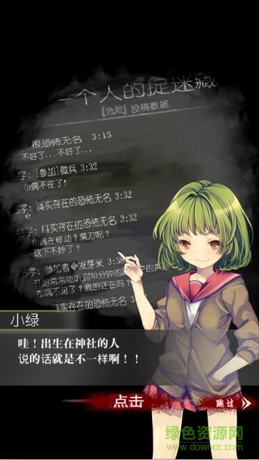 一个人的捉迷藏中文汉化版是一款是非常恐怖的日式游戏,四名作死的女高中生为了追求刺激,聚在一起开始试验这个恐怖的传说,不想真的召唤出恐怖的幽灵,从而陷入绝望的深渊中。欢迎来绿色资源网下载。温馨提示,胆小勿入!!!