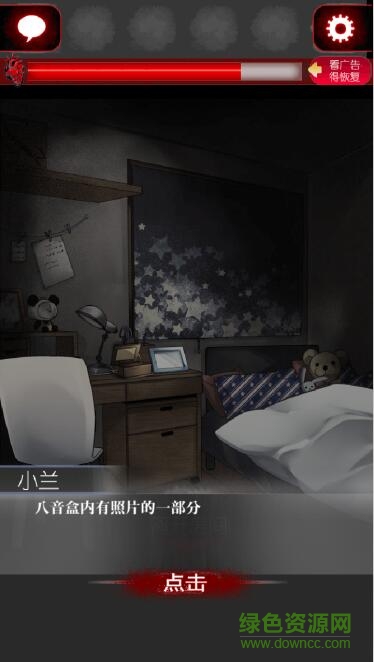 打开柜子后,获得蓝色手帕,用来擦床上的照片的血迹,又获得一张照片碎片。回到自己的卧室,突然发现鬼又来了,就近躲起来吧,中间八音盒还响一次,等会走之后,把照片碎片拼在桌子上的相框里,结束。