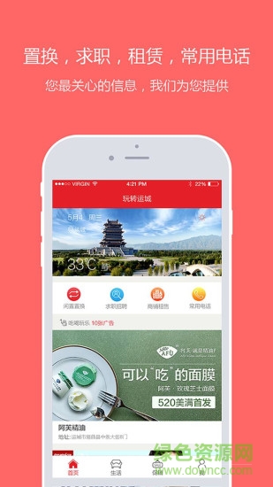 玩转运城这里有很全的生活娱乐、置换、租赁、美食、酒店、购物信息,只有你想不到,没有你找不到,可以随时获取运城最新动态,吃喝玩乐衣食住行畅享同城优惠,绿色资源网强烈推荐该应用,二手市场、求职招聘等最新的运城资讯都在这里,让你轻轻松松玩转运城