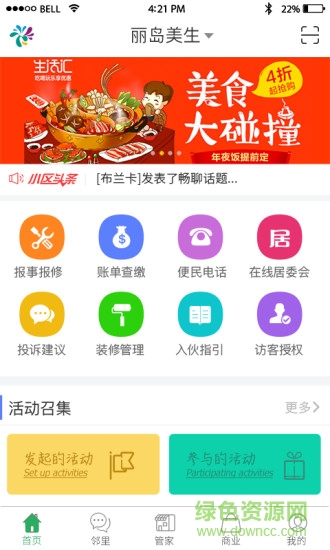 3、作为您的贴心管家,可以实现在线报事报修、访客授权、活动召集、家政服务、物业服务、居委会、天天购等功能模块;