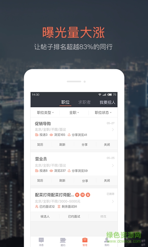 排名靠下意味着没人投简历,刷新、置顶、设置精品职位,简单操作排名超越83%的老板;