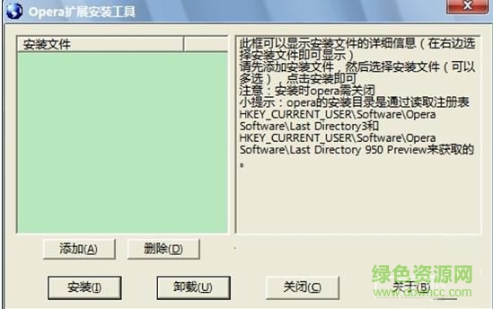 Opera扩展安装工具是一款非常好用的浏览器辅助工具,功能强大,使用方便,帮助用户们快速安装浏览器扩展工具,有需要的朋友们不要错过了,欢迎大家来绿色资源网下载使用!