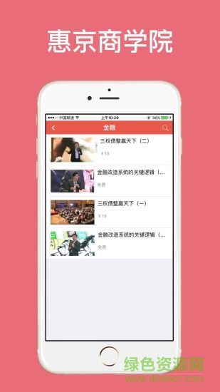 惠京商学院app是一款专注于行业技能培训学习的客户端。为学员们提供了丰富的课程资源,涵盖笑死、金融等学习内容,学员们可以在线免费观看需要的课程信息,随时随地进行学习,不断提供专业水平!欢迎用户在绿色资源网下载使用。