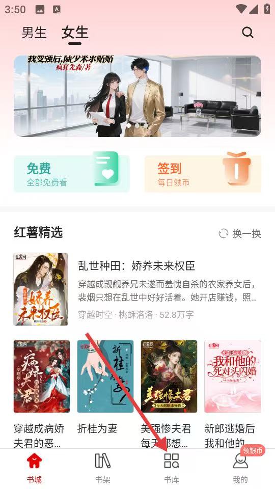 1、打开红薯阅读,找到并点击底下的书库按钮。
