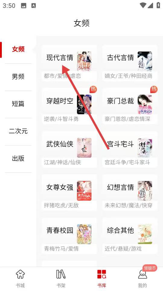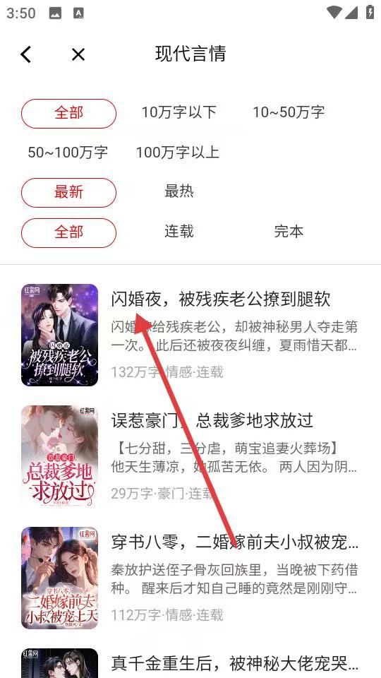 3、在现代言情小说页面,选择喜欢的小说并点击。