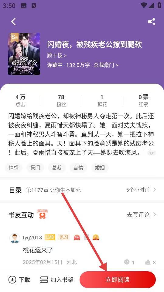 4、进入小说详情页面,点击立即阅读按钮,即可开始阅读小说。