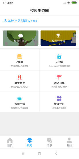 校园zone主要有两大功能板块,校园动态和校园助手。校园动态包含学校通知、校园说吧、男生女生贴吧等。校园助手包含z学堂、z小铺、校园封神榜、许愿树、便捷打印、周边惠等。为在校同学们创造一个集学习、娱乐、竞争、交易、共享、联络于一体的功能性平台。