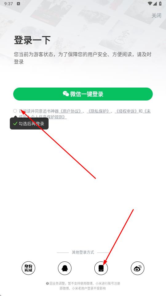 1、勾选已阅读并同意追书神器用户协议、隐私保护、侵权申诉和未成年人个人信息保护规则后,可点击手机号一键登录,也能选择下方身份认证等其他登录方式完成账号登录。