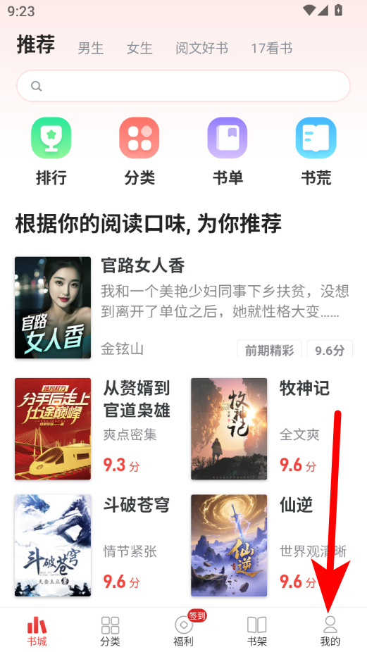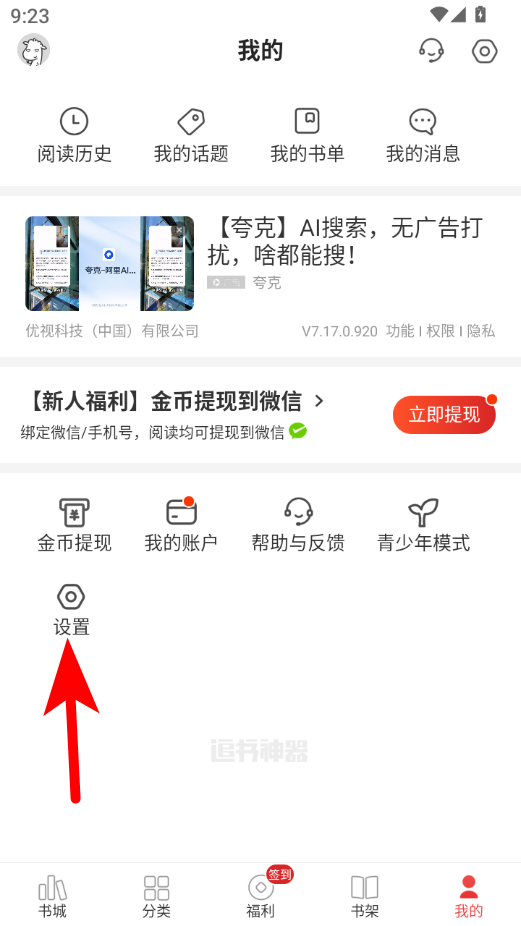 1、在追书神器主界面,点击右下角我的选项,进入个人中心界面。