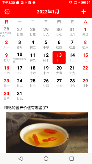 1.日历查看:标记放假日期,任务标识,农历提示
