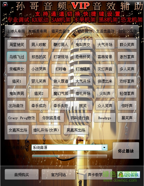 孙哥音频VIP辅助音效是娱乐各种主持人专用的音效,包含全套音效,可设置快捷键,请注意设置通道,有声卡的,设置成声卡通道,笔记本外置声卡无需设置通道。