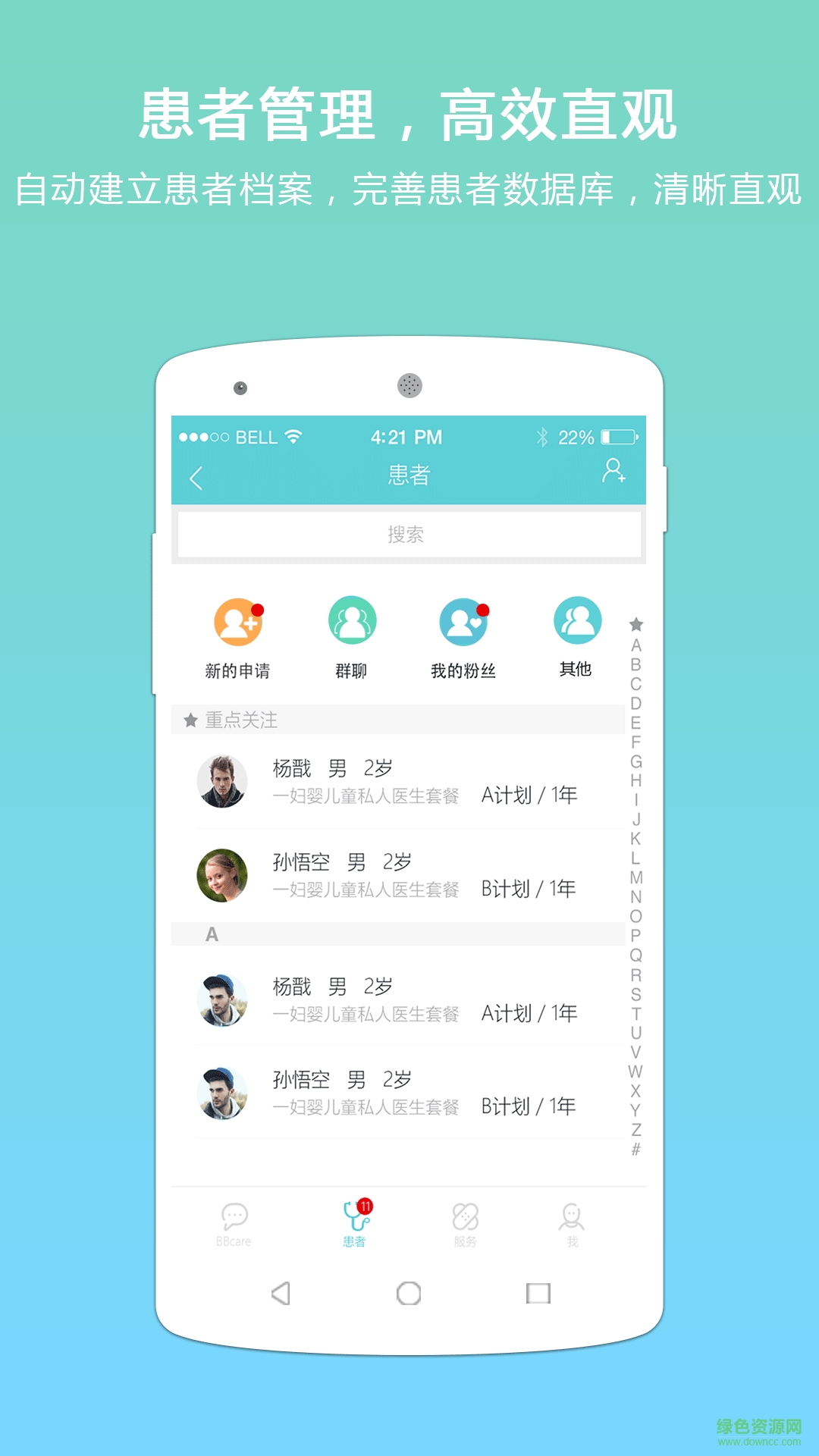 3、患者管理,高效直观:自动建立患者个人档案,完善患者数据库,分组管理,清晰直观;患者资料,一目了然